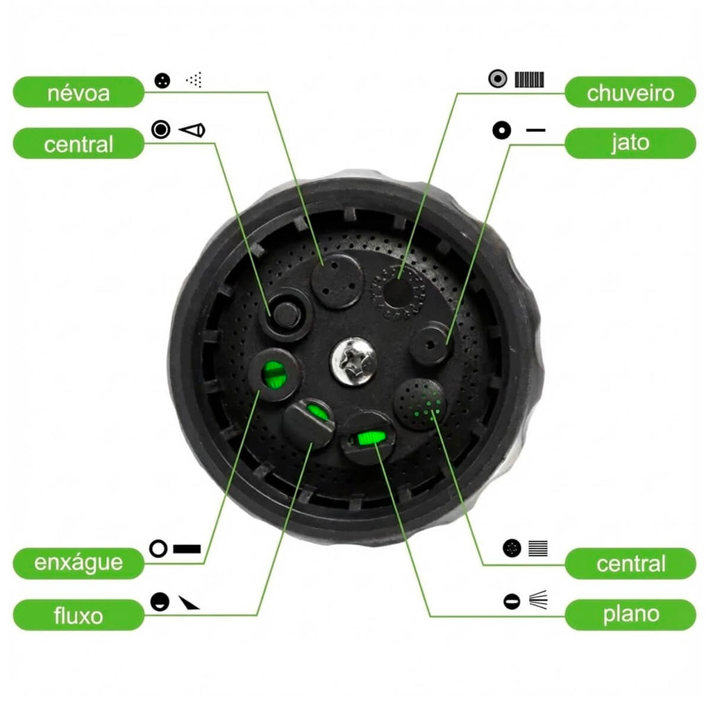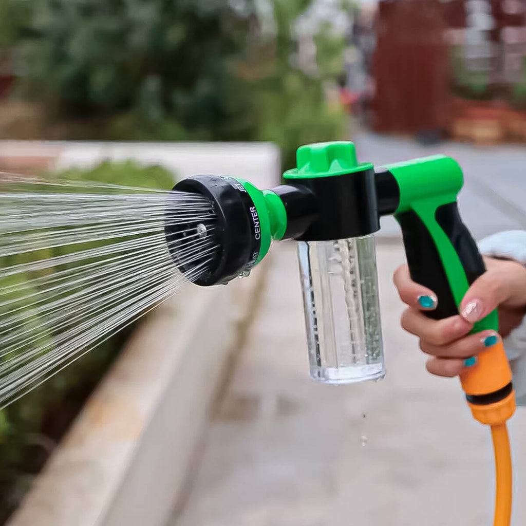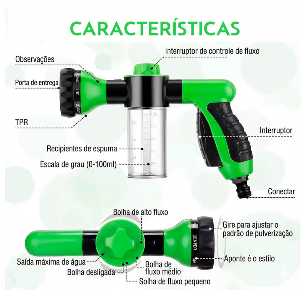O Esguicho 8 em 1 para Mangueira com Reservatório de Sabão oferece praticidade e alta performance para limpeza doméstica, lavagem de veículos, jardinagem e inúmeras tarefas do dia a dia. Com oito modos de jato selecionados por rotação, ele permite ajustar facilmente o tipo de saída de água conforme a necessidade. O botão de acionamento com um toque proporciona uso contínuo e confortável, enquanto a vazão ajustável garante controle total do fluxo. Possui bico rotativo, ponteira tipo mamadeira e reservatório transparente para sabão, tornando o processo de lavagem mais eficiente e rápido.