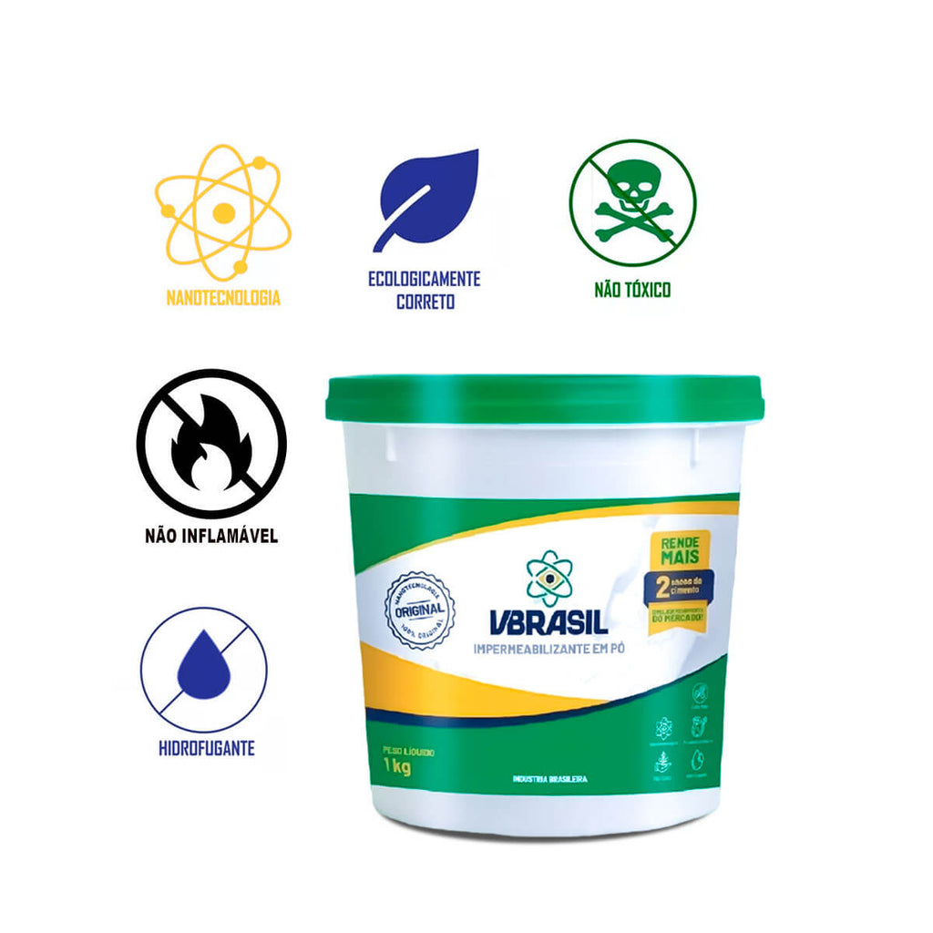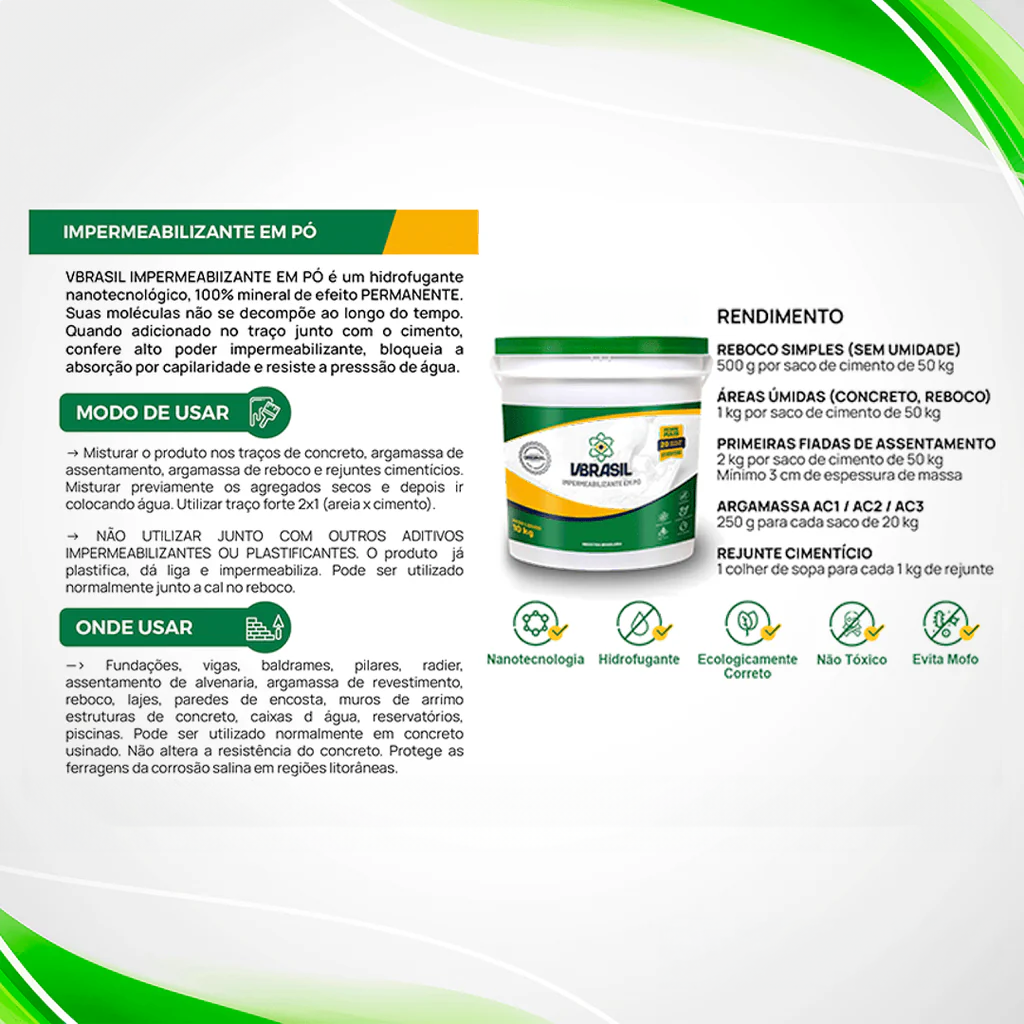 O VBrasil Impermeabilizante em Pó é um hidrofugante, desenvolvido com nanotecnologia, usado como aditivo impermeabilizante para concreto.