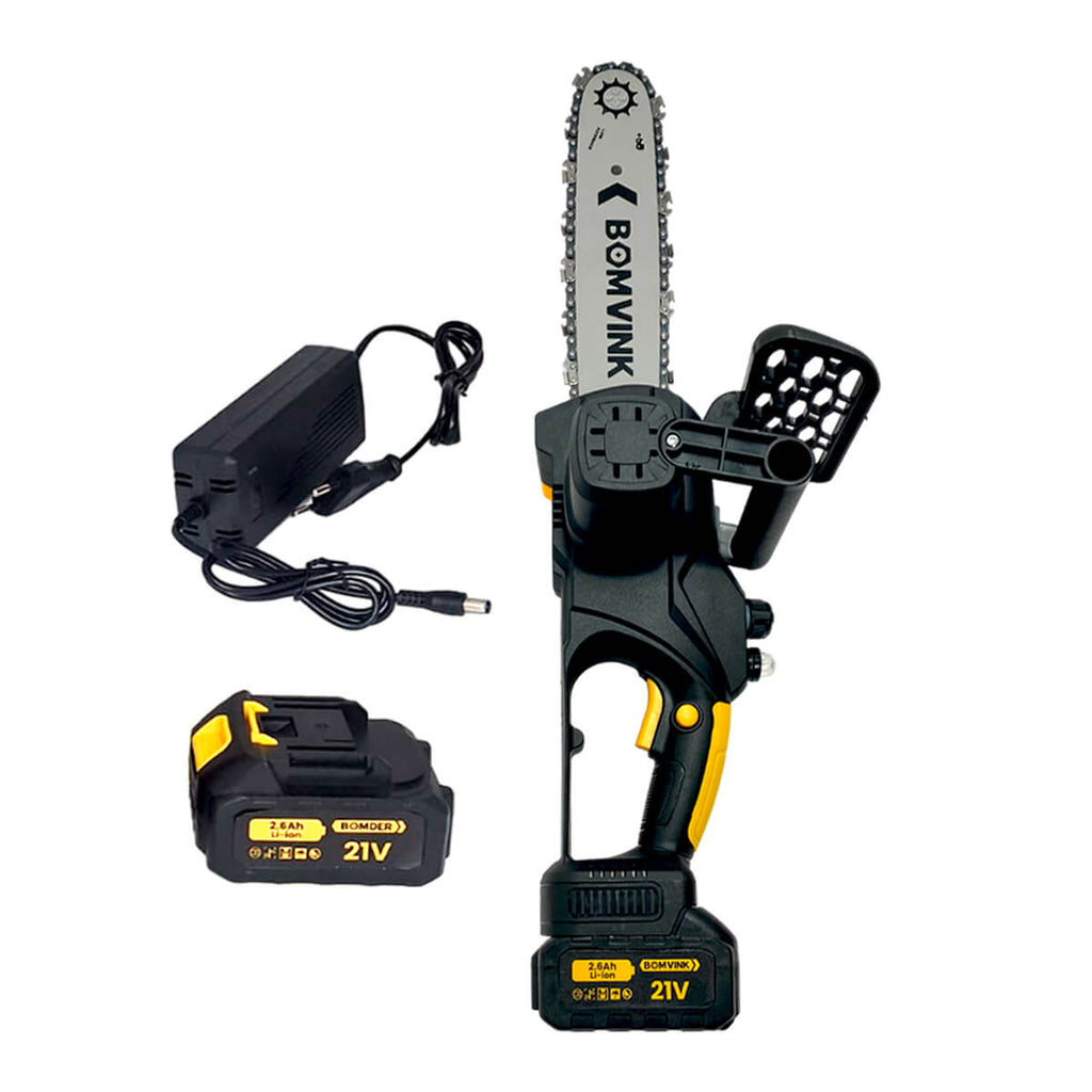 A Moto Serra Elétrica Portátil Recarregável é uma poderosa ferramenta com 2 baterias de 21v de 2600mAh cada, um sabre de 28cm (12 polegadas) para cortes precisos e uma construção compacta e ergonômica. Sua capacidade de recarga a torna ecologicamente amigável, oferecendo longos períodos de uso contínuo, tornando-a ideal para uma variedade de projetos de corte.