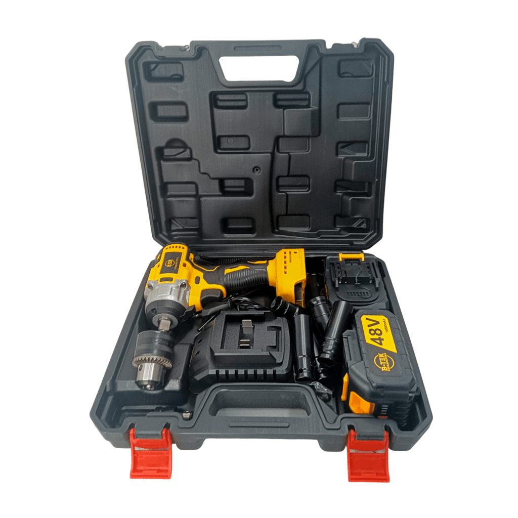 Parafusadeira Furadeira de Impacto com 2 baterias lítio de 48V, ferramenta de uso profissional, em modelo forte, robusto e ergonômico. Empunhadura emborrachada, anti-deslizante, com controle reversível. Traz mais mobilidade, economia e praticidade durante o uso por não depender de fios e ser portátil.