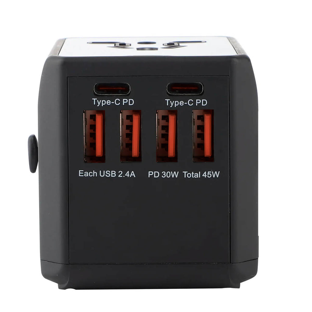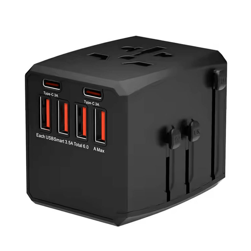 O Adaptador Universal com 4 USB e 2 USB-C é a solução ideal para viagens internacionais, permitindo carregar múltiplos dispositivos simultaneamente de forma rápida e eficiente. Compatível com mais de 150 países, inclui plugues para US, AU, UK e EU, garantindo versatilidade para qualquer destino. Com potência de 36W, oferece carregamento otimizado para smartphones, tablets, notebooks e outros dispositivos eletrônicos. Seu design compacto e portátil facilita o transporte, tornando-o essencial para viagens e uso diário.