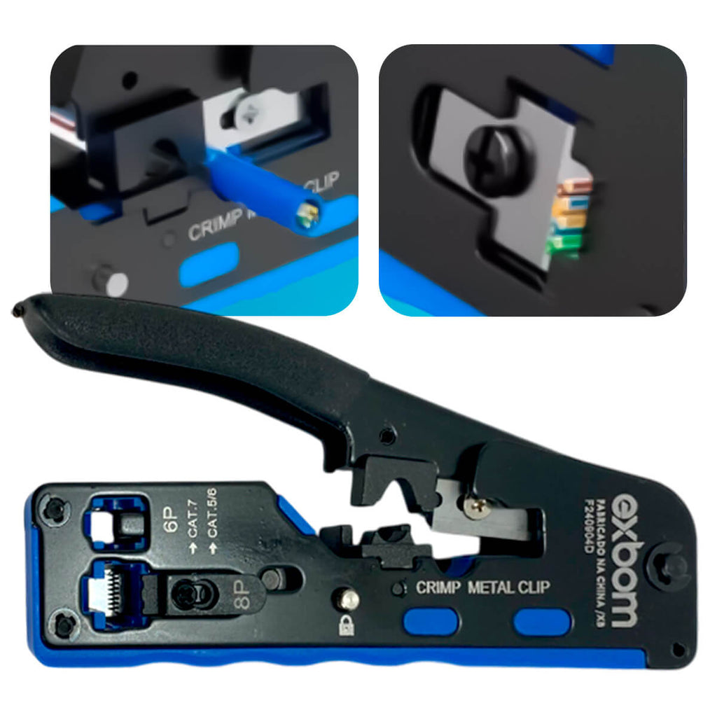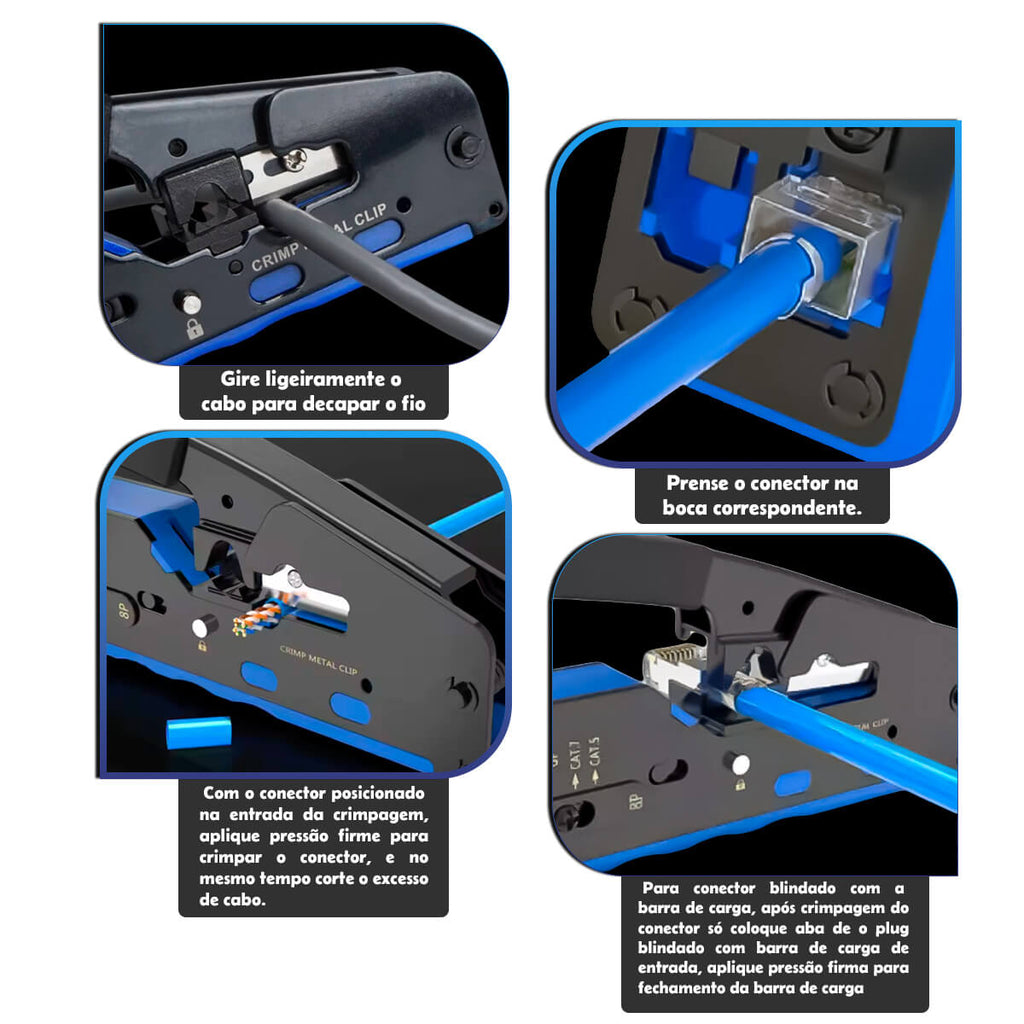 • Compatibilidade: Conectores RJ45 (Cat 7, Cat 6, Cat 5e), RJ12 e RJ11 (4, 6 ou 8 vias).