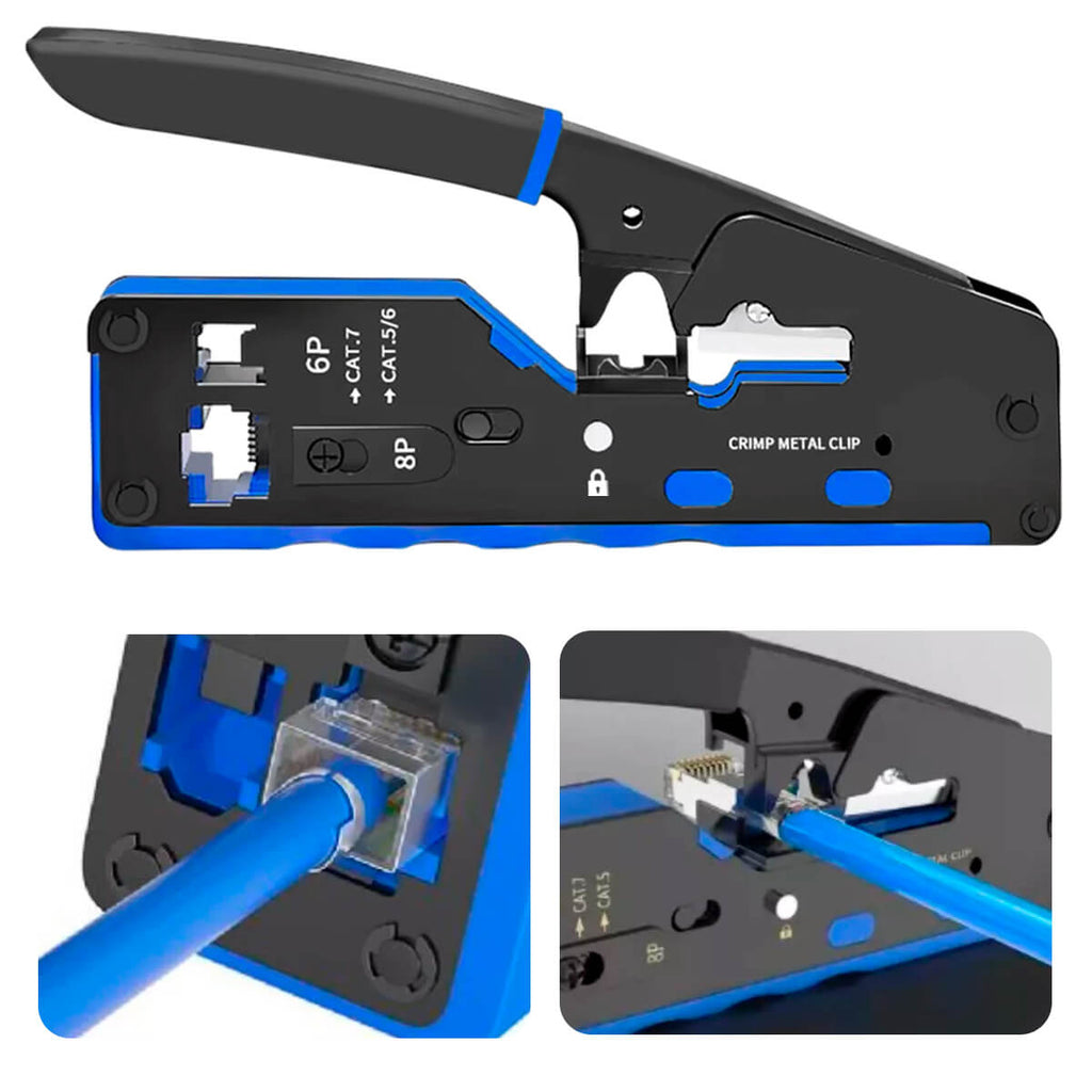 Desenvolvido para profissionais que buscam praticidade e eficiência, este alicate compacto é ideal para instalações rápidas e precisas. Ele é compatível com diversos conectores de rede, incluindo RJ45 Cat 7, Cat 6e, Cat 5e, RJ12 e RJ11, além de plugues modulares padrão e conectores de passagem Easy Crimp. Com lâmina integrada, o excesso de fio é cortado automaticamente durante a crimpagem, garantindo um acabamento perfeito. O design antiderrapante oferece segurança e conforto durante o uso, enquanto a catraca de bloqueio de segurança facilita o armazenamento e transporte.