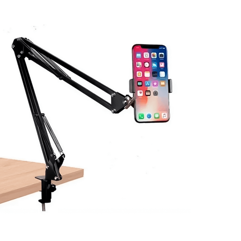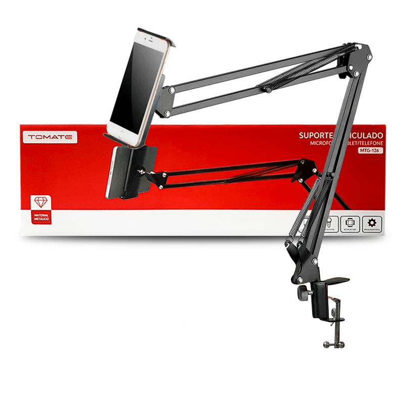 Este nosso Suporte é ajustável os dois braços São flexíveis, a suspensão da montagem da braçadeira da mesa é completamente flexível e com molas flexíveis e temperadas, firmemente anexável a uma mesa. Os braços dobráveis permitem que você ajuste um ângulo e altura que você gosta para seu celular que é fixado no suporte. Feito de quadro de ferro, suporte do grampo de ferro; apropriado para a maioria dos celulares Você quer ter mais visibilidade e estar com seu celular e fazer suas lives com mais tranquilidade, e a cada momento em um ponto diferente em sua mesa, então este é o suporte de celular ideal para você comprar, pois além de bonito, elegante e com alta qualidade em aço que ele é fabricado. Este braço articulado tem a rotação de 360º da sua base, é flexível e pode ser ajustado no ângulo necessário, esse braço articulado é ideal para a instalação em mesas em casa, escritório ou seu estúdio. Adapta-se a maioria dos celulares no Brasil.