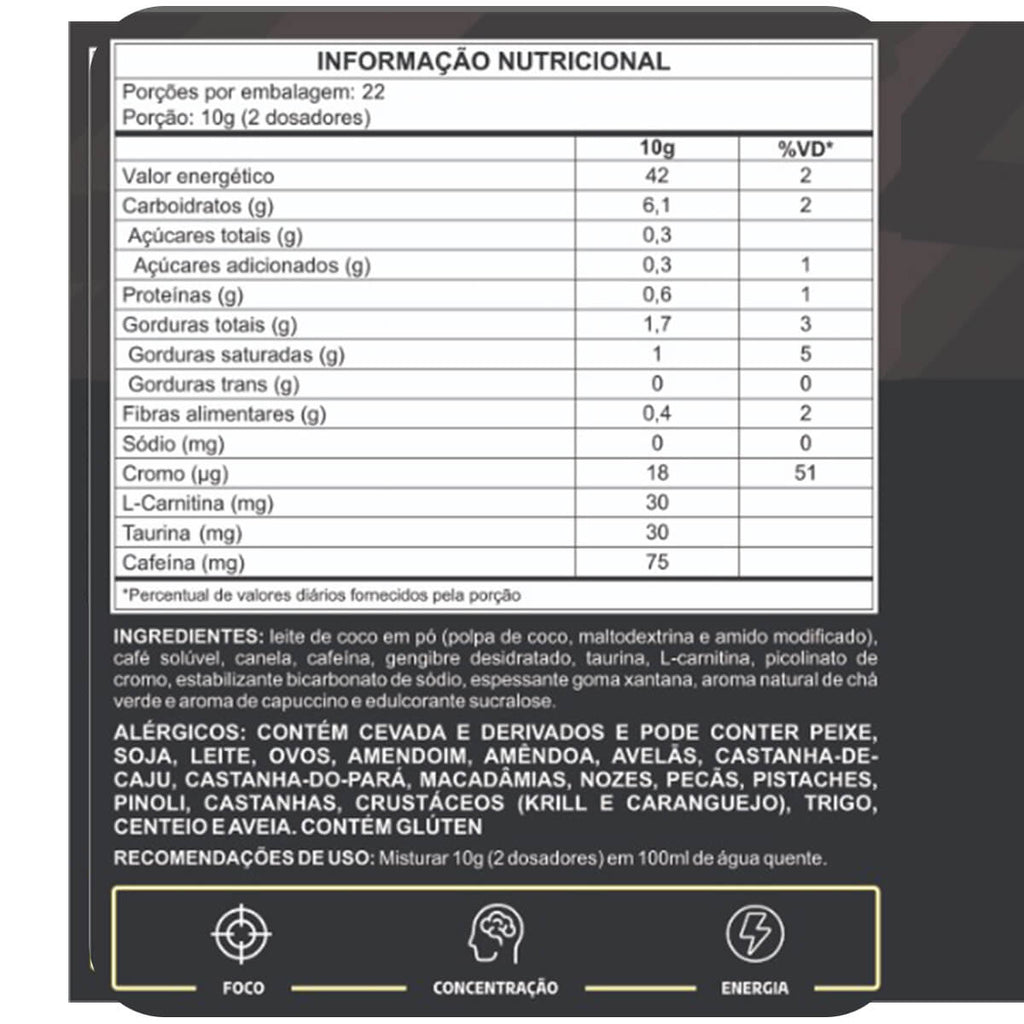 O Turbo Coffee oferece uma fórmula premium com ingredientes cuidadosamente selecionados, como gengibre, taurina, canela, L-carnitina, cafeína e picolinato de cromo, proporcionando um impulso de energia, foco e concentração. Sua versatilidade permite ser servido tanto quente quanto frio, adaptando-se às preferências individuais. Com zero lactose e um sabor delicioso de cappuccino, cada dose oferece uma experiência revigorante e nutritiva para o seu dia.